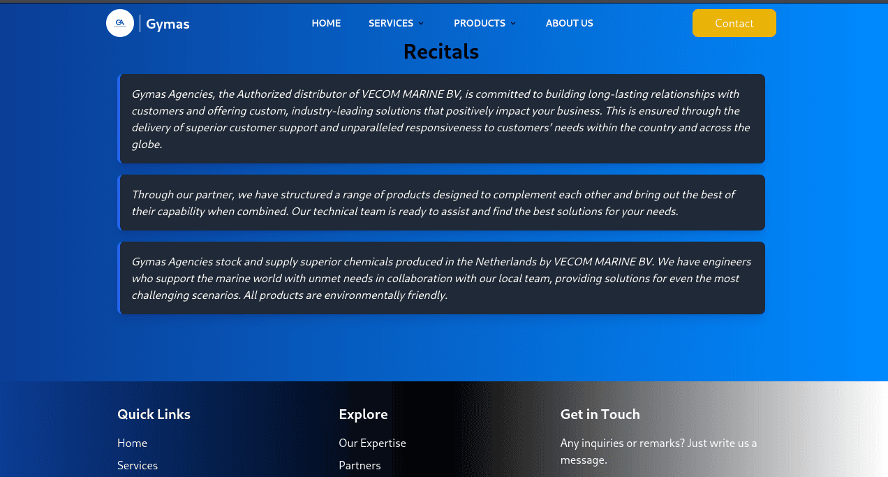 Client project for Gymas Agencies Limited, authorized distributor of Vecom Marine BV products in Kenya. Collaborated with a UI/UX designer to implement a clean, modern static website highlighting the company's services in marine cleaning, water treatment, cargo hold maintenance, and supply of specialized chemicals and equipment. Focused on clear presentation of company mission, vision, values, partnerships, and product categories.